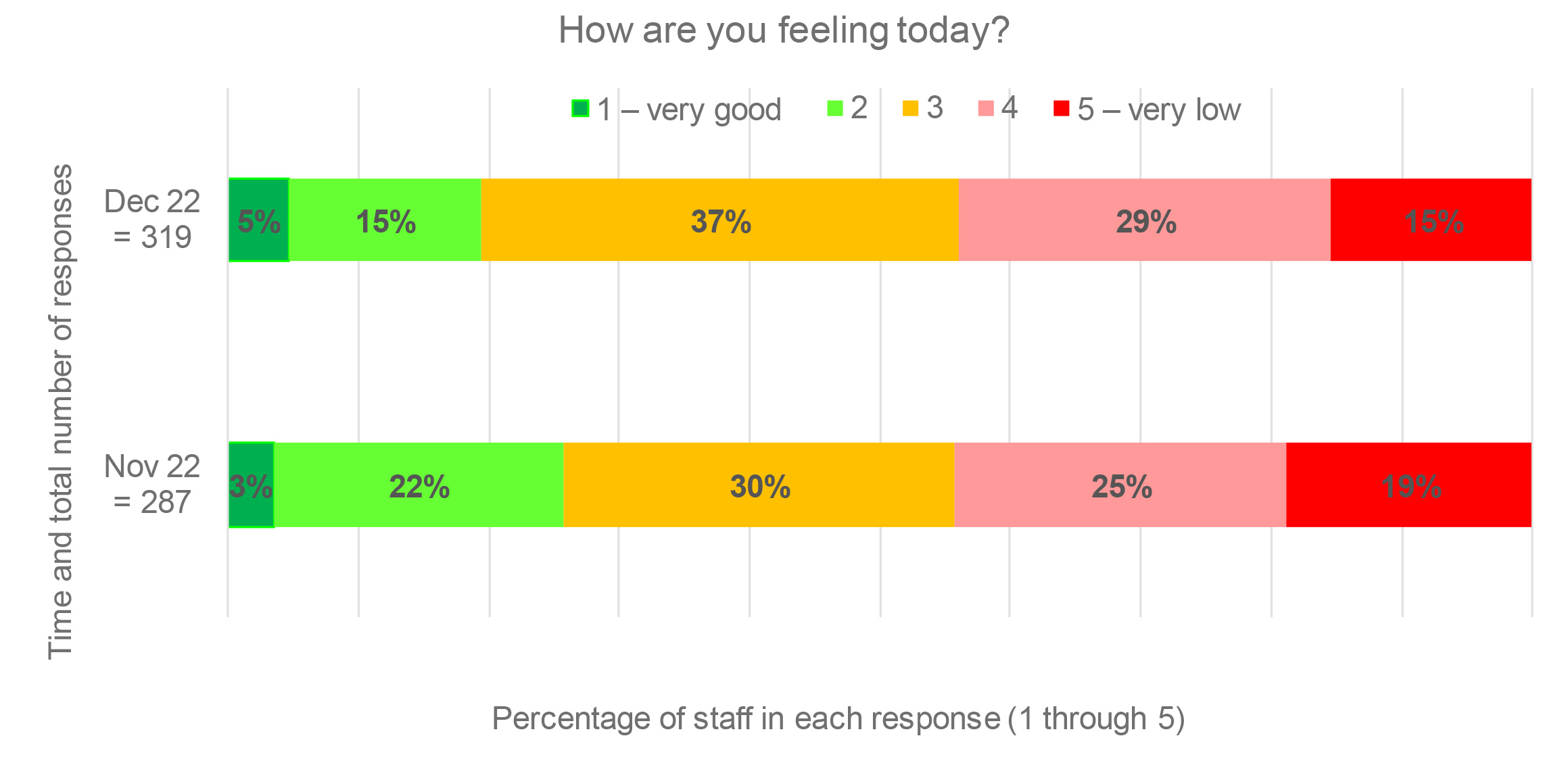 We continue to use the Pulse health and wellbeing survey to establish a regular way of finding out how staff are feeling as stated in Measure 9. We are reporting this as Red for Quarter 3. During Quarter 3 we issued two health and wellbeing surveys. The survey results indicated a consistent response across the five survey response categories but a lower response rate than previous surveys (24% in Nov 22 and 26% in Dec 22). The survey issued in November indicated the highest percentage of staff rating their health and wellbeing at the ‘very low’ end of the response scale. The average results for Quarter 3 also indicated that fewer staff are rating their wellbeing as ‘very good’ or ‘good’ compared to previous quarters and the 2021-2022 baseline average.