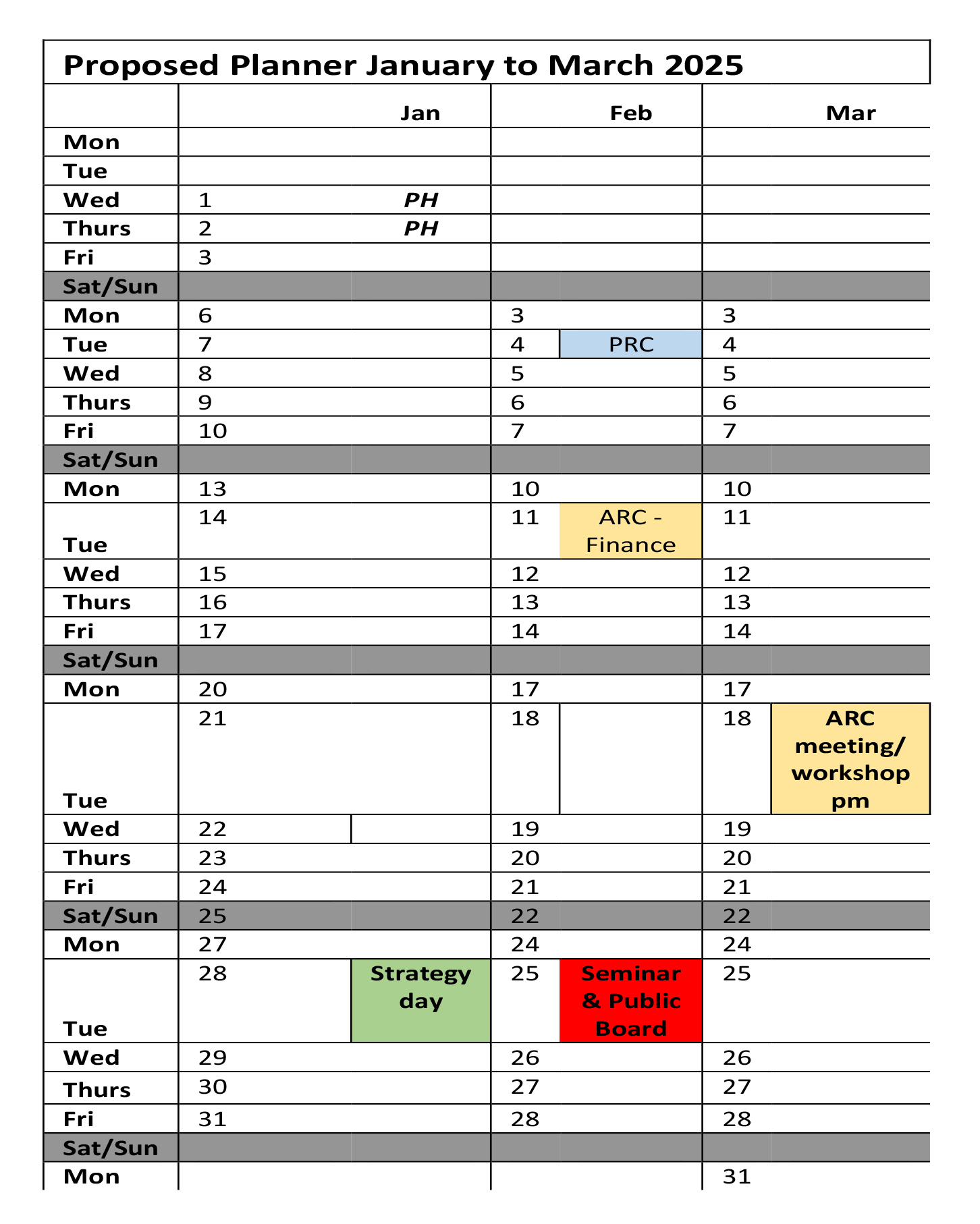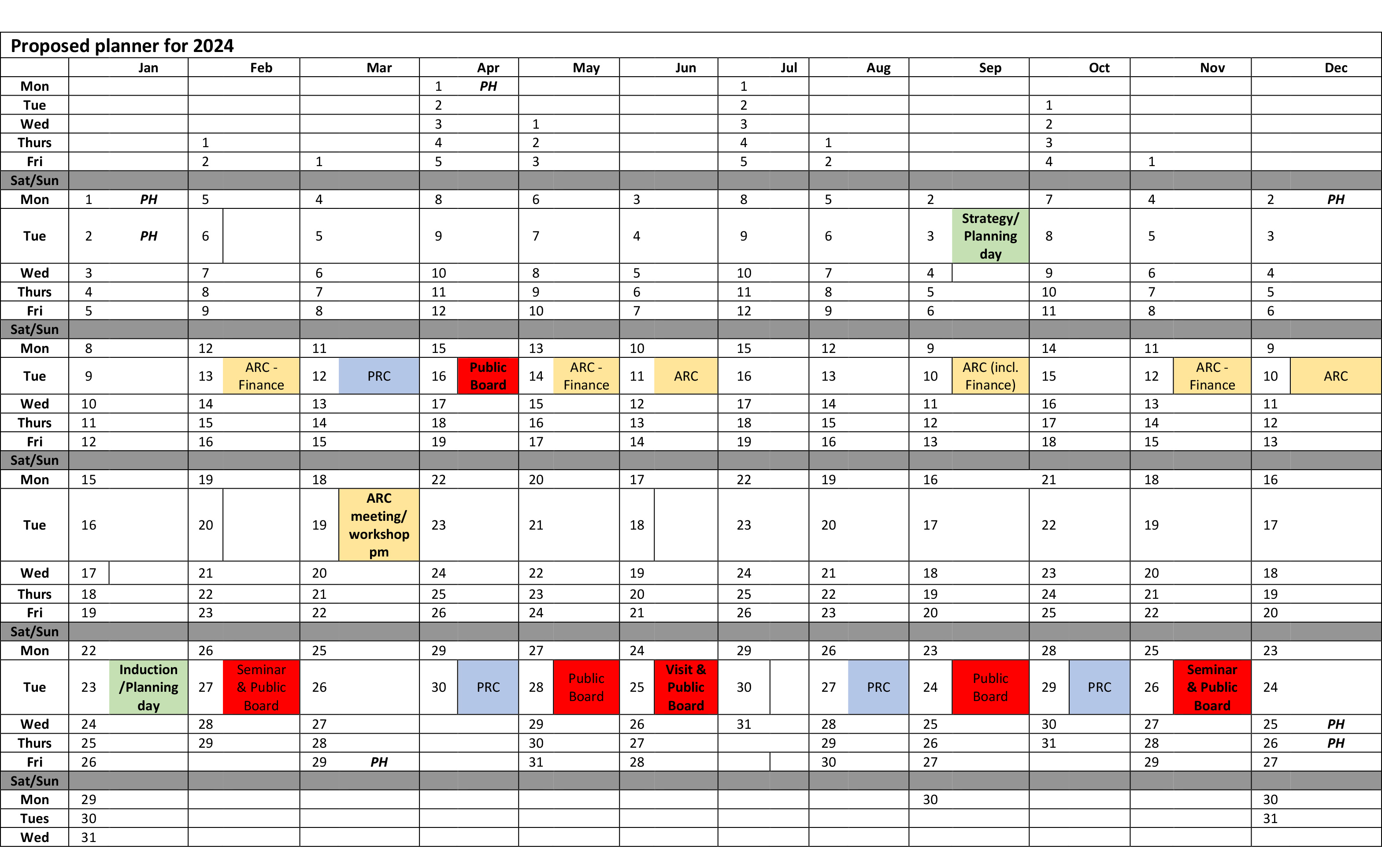 A proposed schedule of meeting dates from January 2024 is provided in this paper. The Board is invited to approve this as its working calendar to March 2025. The draft schedule is provided as early as possible to allow members to plan their forward diaries. This paper also presents an updated Planner with the proposed seminar sessions and strategic items for tabling at Agency Board and Strategy meetings to December 2023.