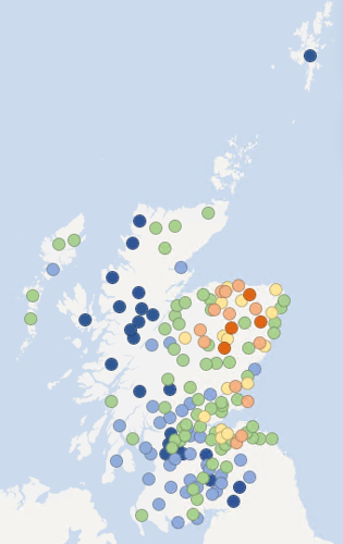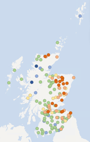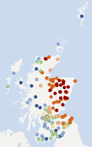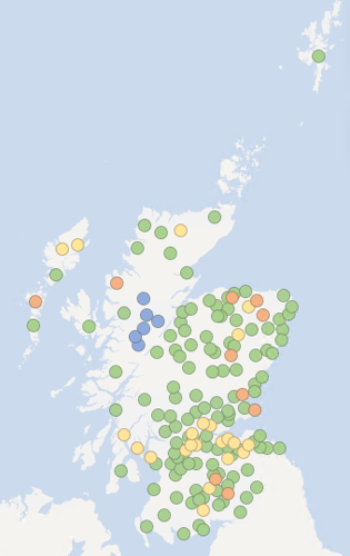 The maps below show recent groundwater and loch level compared to the long-term record at each individual station. Level is reported as high or low compared to the typical (‘normal’) level range for the time of year.