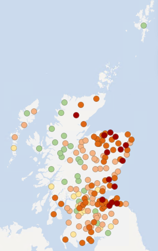 The last month of rainfall shows mostly normal conditions across Scotland. Wet conditions are present locally to the north of the great glen, while quite dry conditions are observed in some parts of the Outer Hebrides, the northeast and the central belt. River flows over the past 30 days continue to display an east to west split across Scotland, with eastern areas seeing low to very low flows, and western areas and the Northern Isles generally showing normal conditions.