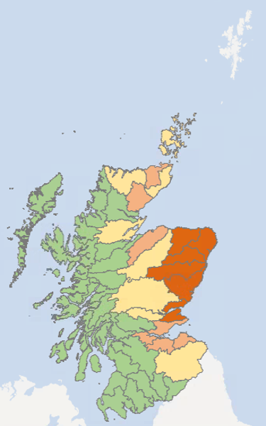 The Spey, Deveron, Ythan, Don (Aberdeenshire), Dee (Aberdeen), Esk, Firth of Tay and Tyne (Lothian) river catchments remain at Moderate Water Scarcity.