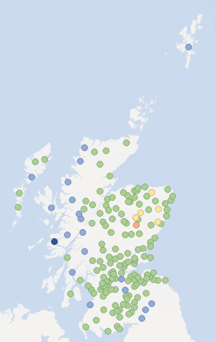 Based on the June average, loch levels from our monitoring points show very low levels in the northeast of Scotland with loch levels elsewhere between normal and very high.