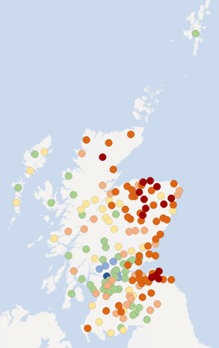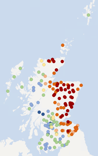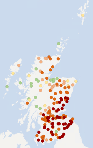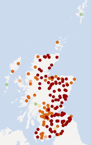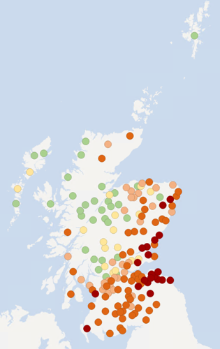 The maps below show recent groundwater and loch level compared to the long-term record at each individual station. Level is reported as high or low compared to the typical (‘normal’) level range for the time of year.